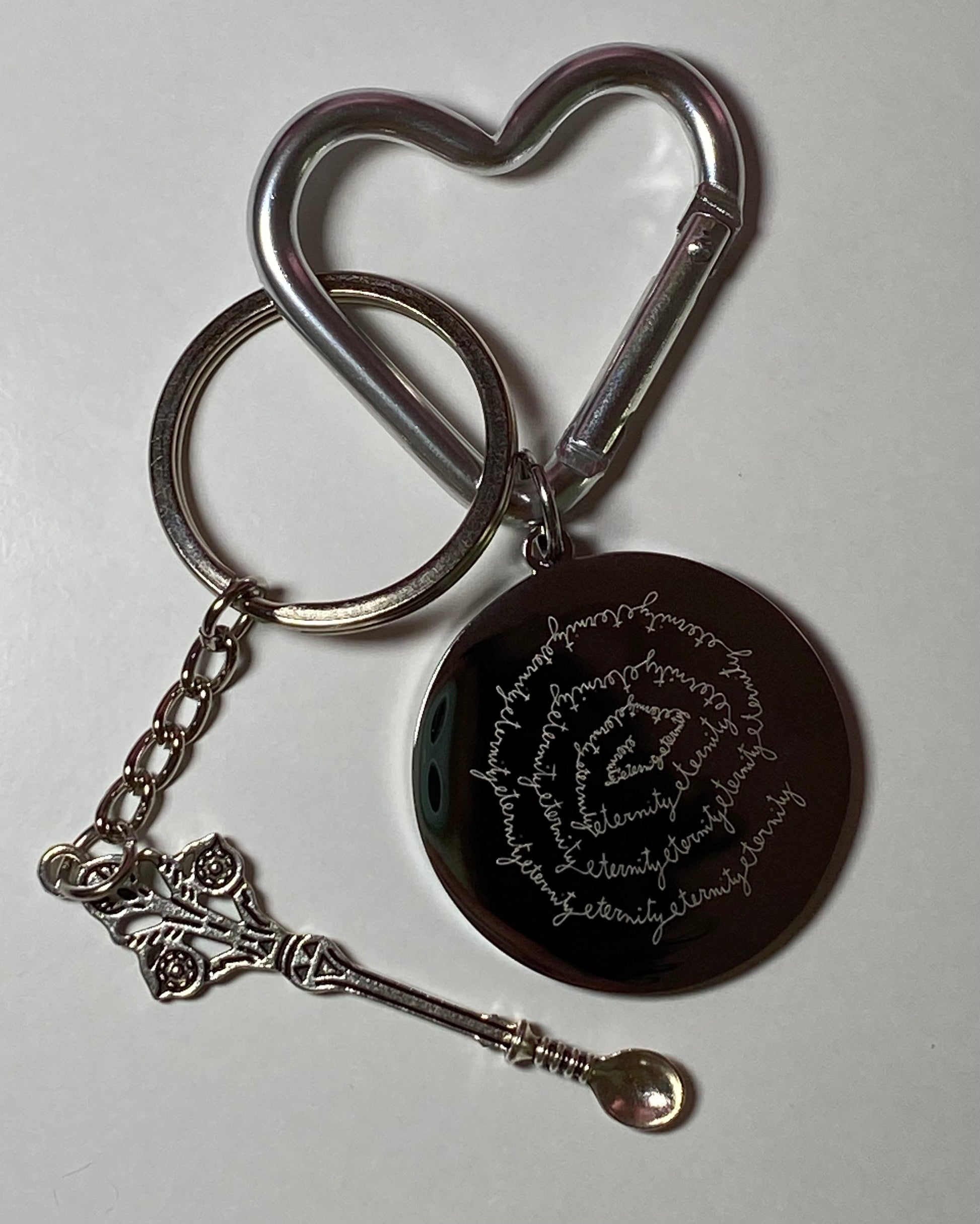Ornate vintage style miniature soup spoon on chain hanging from a keyring, and double sided eternity pendant both on a heart carabiner. Belt loop or purse charm.
