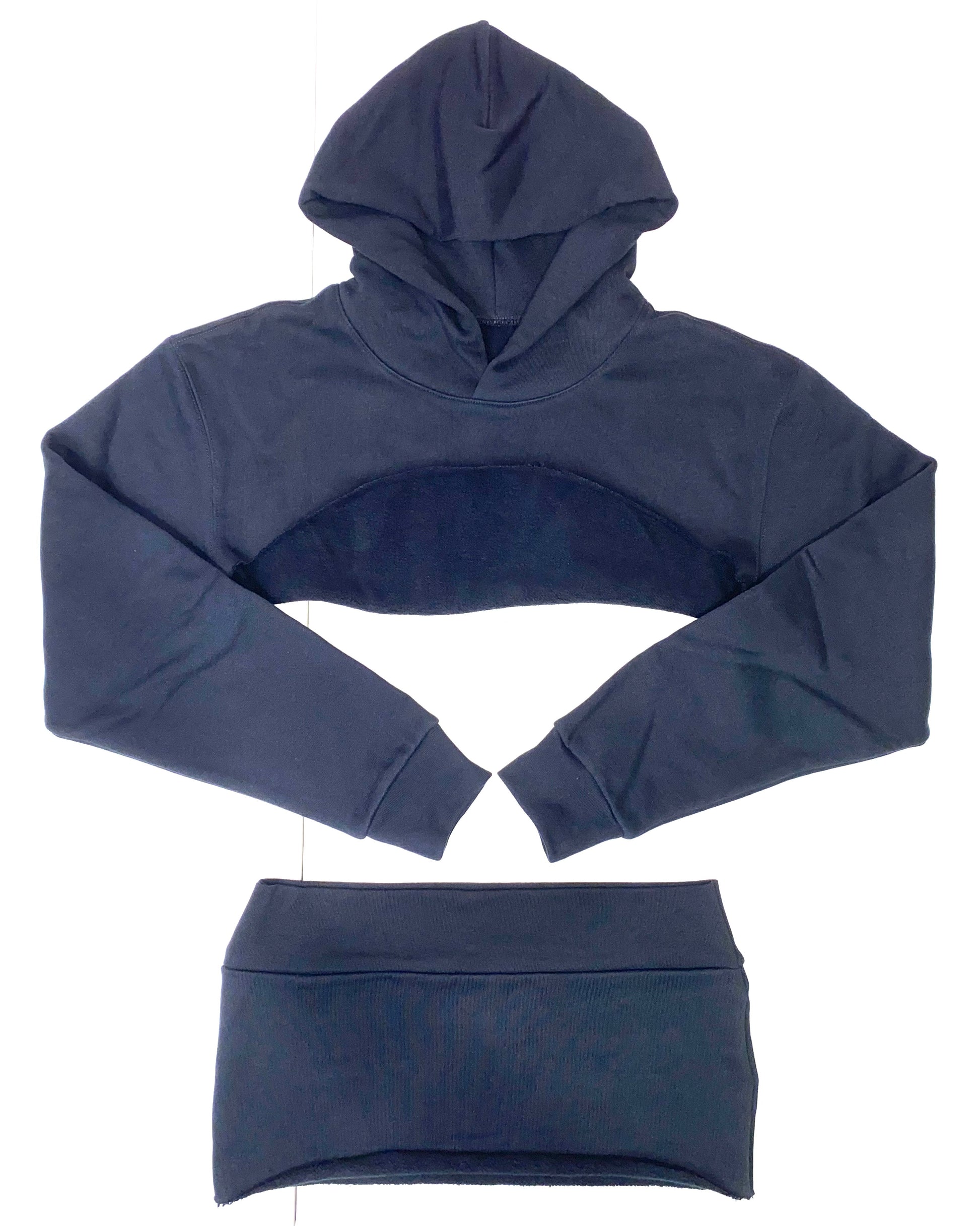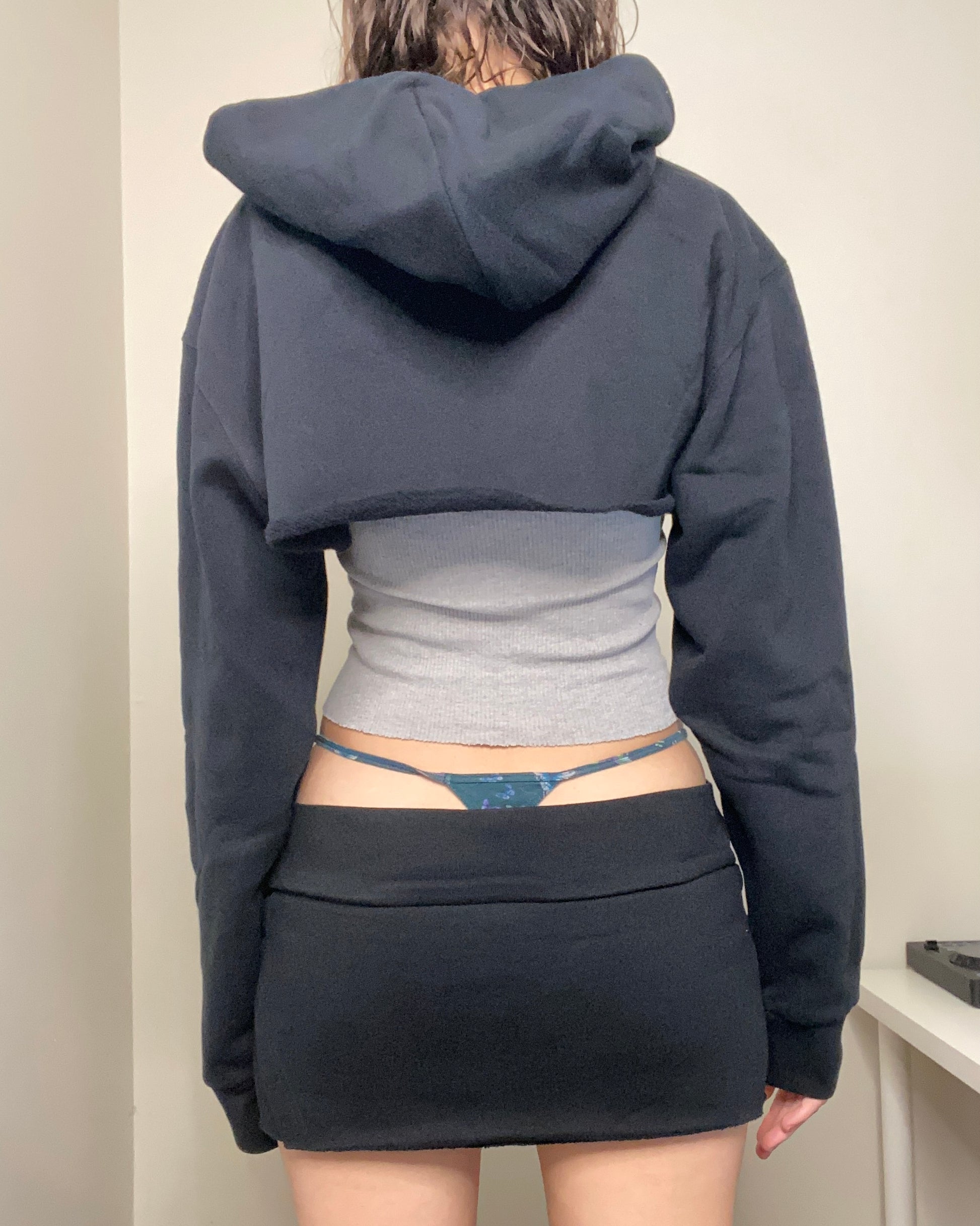 100% cotton heavyweight unisex black hoodie reworked into a shrug and mini skirt set. Top is a super soft hooded shrug. Bottom is a low waisted micro mini made to order for your hip measurement.