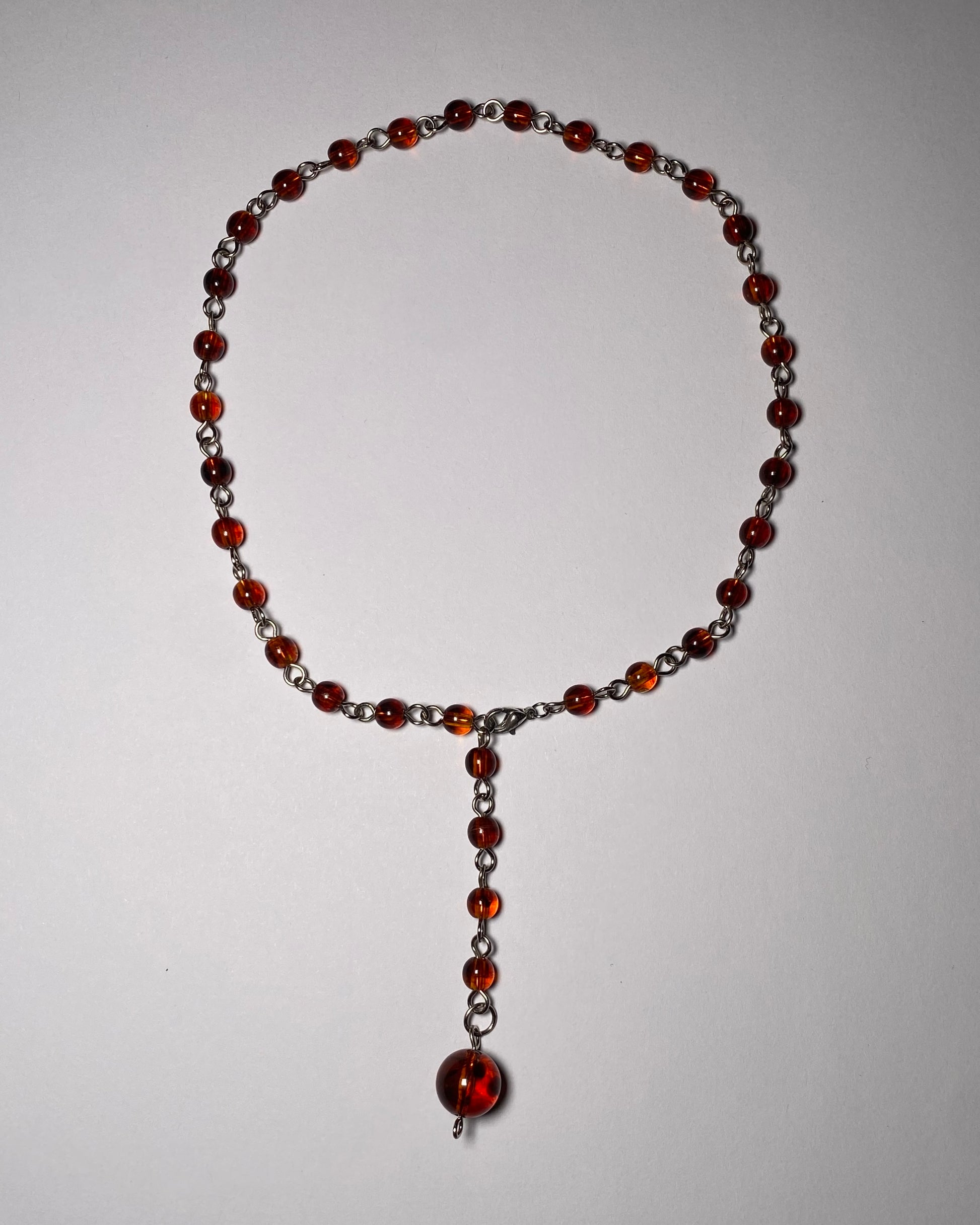 Mahogany transparent rosary bead choker. Attaches at the front for a delicate drop chain with one large bead.