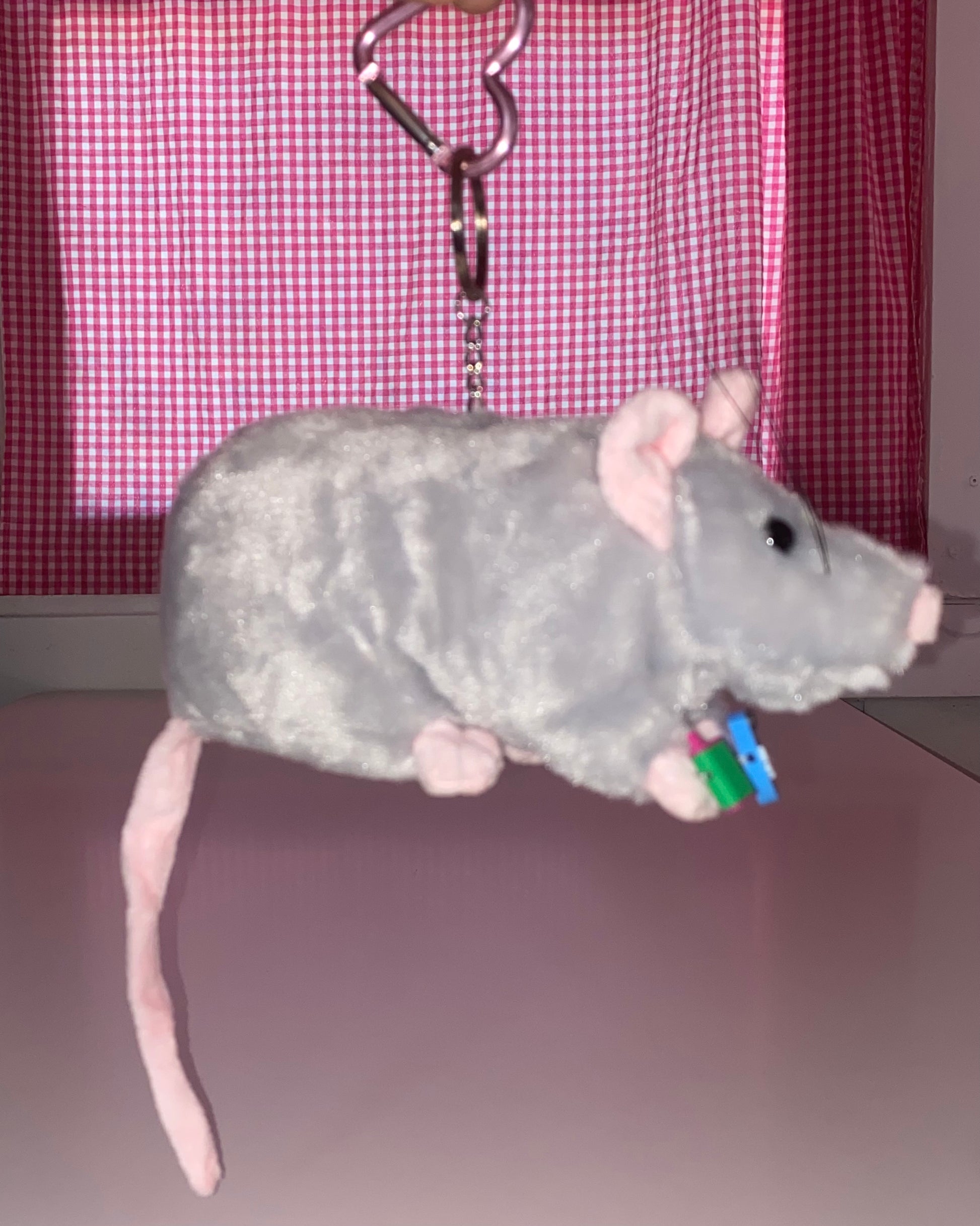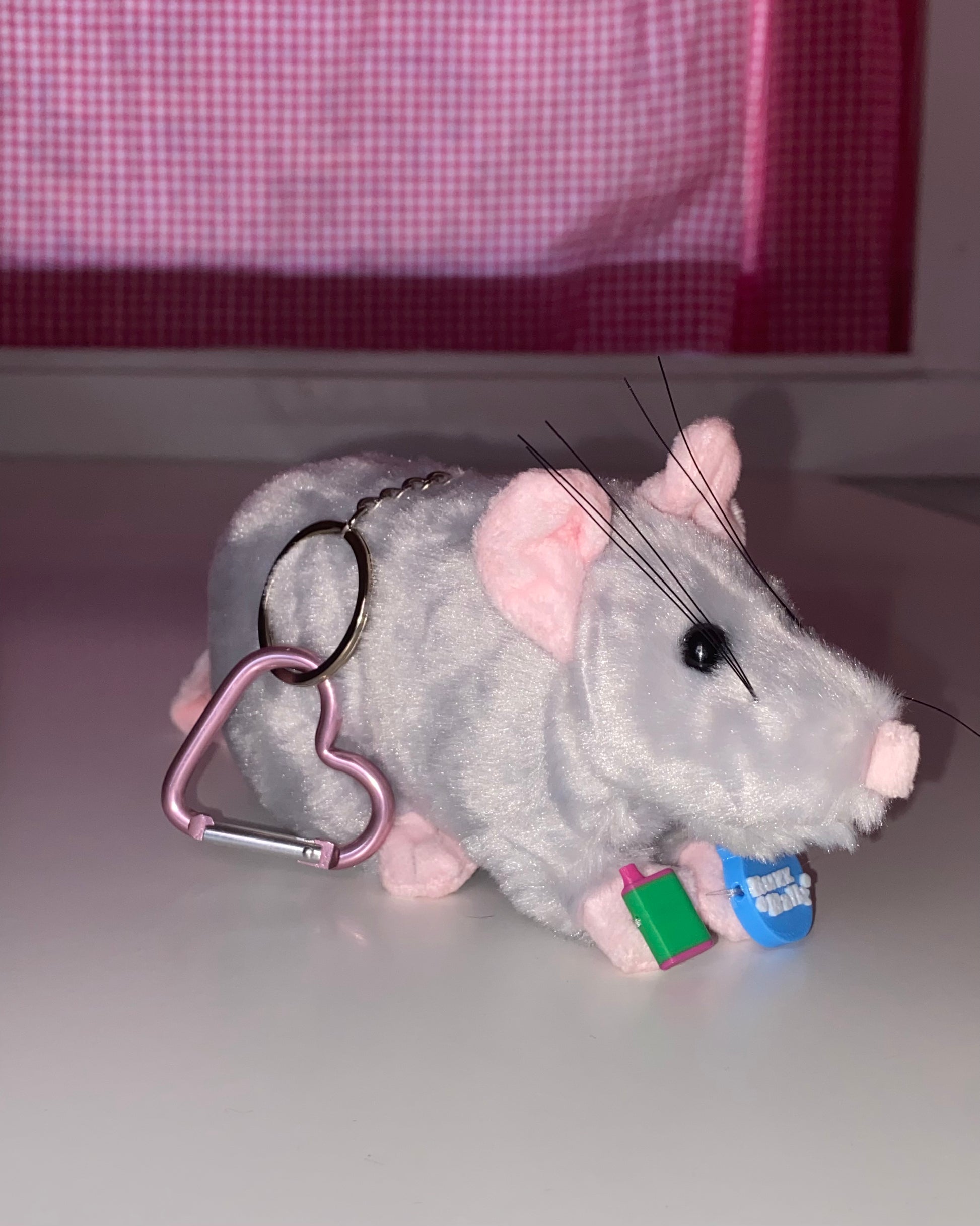 Stuffed rat on keychain holding a blue buzz ball and a watermelon geek bar. Keyring is on a pink heart carabiner because the rat loves you.